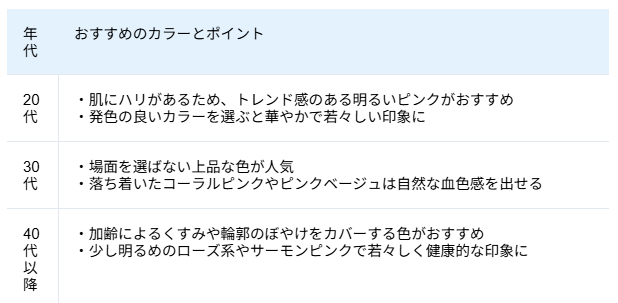 - 血色の悪さが気になる方:自然な血色感を出したい方には、肌なじみのよいピンクベージュが人気の傾向です。ほんのりと色づくことで、顔全体の印象がパッと明るくなり、健康的な唇を演出できます。