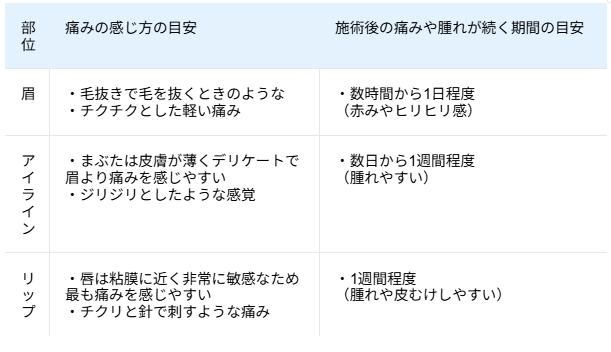 部位別(眉・アイライン・リップ)の痛みの感じ方と持続期間