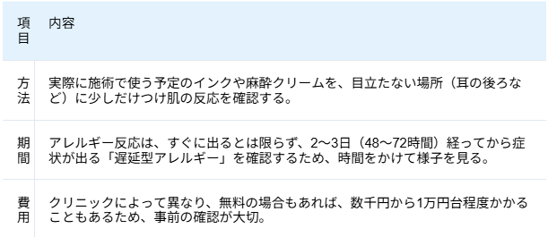 肌がデリケートな方やアレルギーが心配な方にとって、施術で使う色素(インク)や麻酔がご自身の体に合うか事前に確かめる「パッチテスト」は大切なステップです。