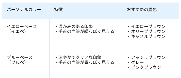 パーソナルカラーは、黄みがかった肌色の「イエローベース(イエベ)」と、青みがかった肌色の「ブルーベース(ブルベ)」に大きく分けられます。肌の色になじむカラーを選ぶと、眉だけが浮くのを防ぎ顔全体に統一感が生まれます。